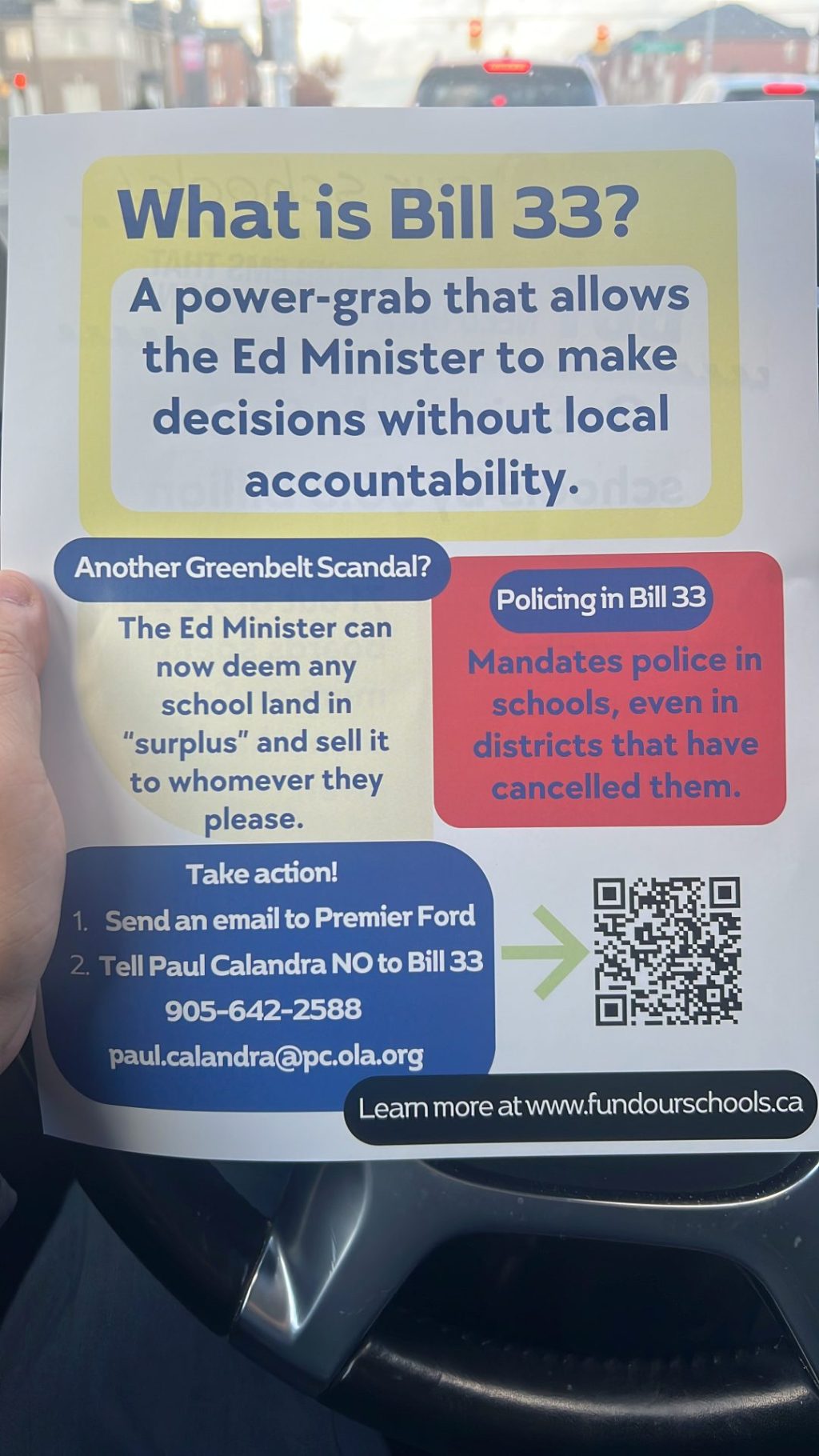 The flyer was clear and passionate. It explained how Bill 33 could change how our schools are governed, how decisions are made, and even who has the final say in what happens inside our classrooms. As a parent and Catholic School Council member, I felt both curious and concerned.